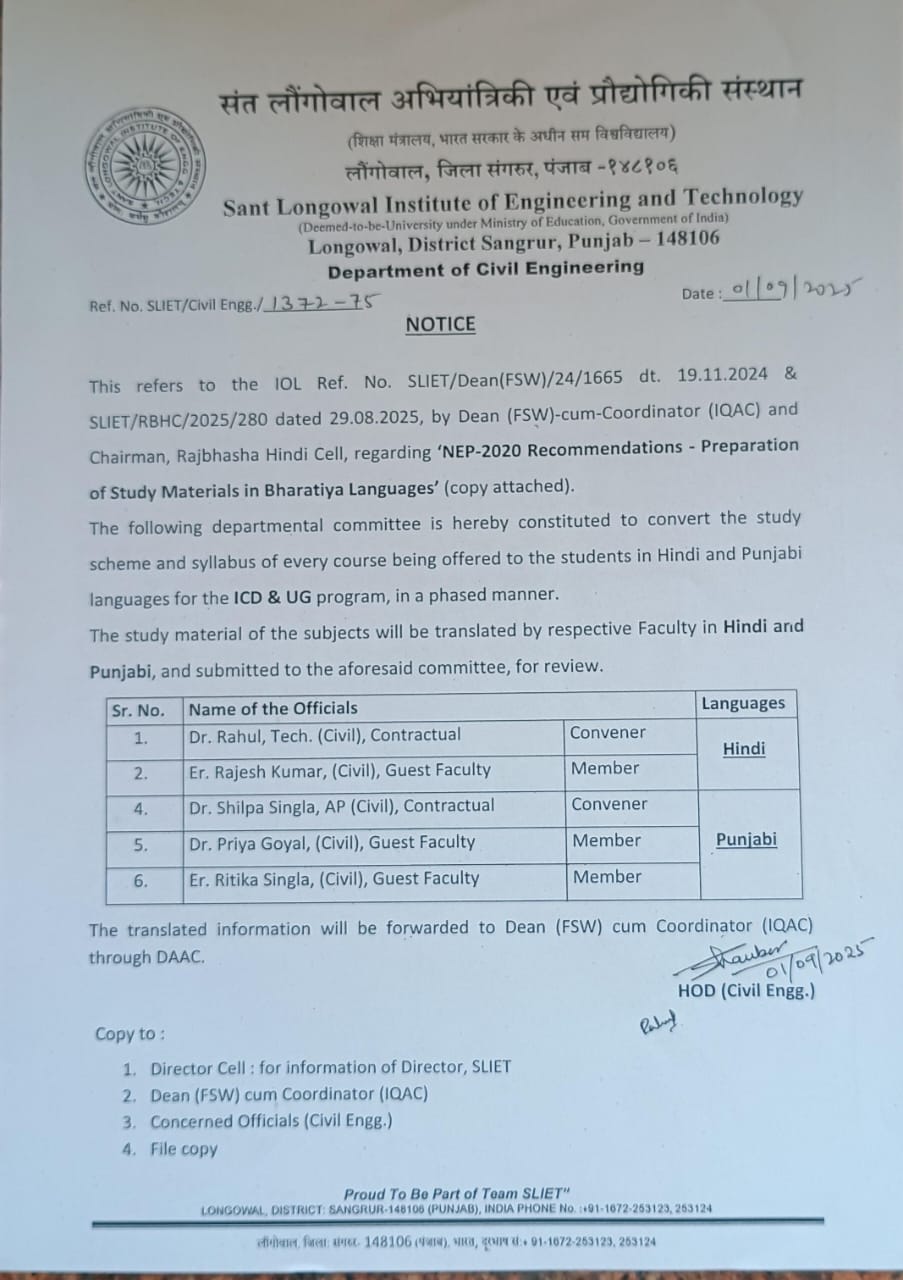 Copyright © 2026 , Sant Longowal Institute of Engineering and Technology, Longowal - 148106 Distt. Sangrur, Punjab, India Developed & Maintained by Administrative Computer Services System (A.C.S.S), SLIET